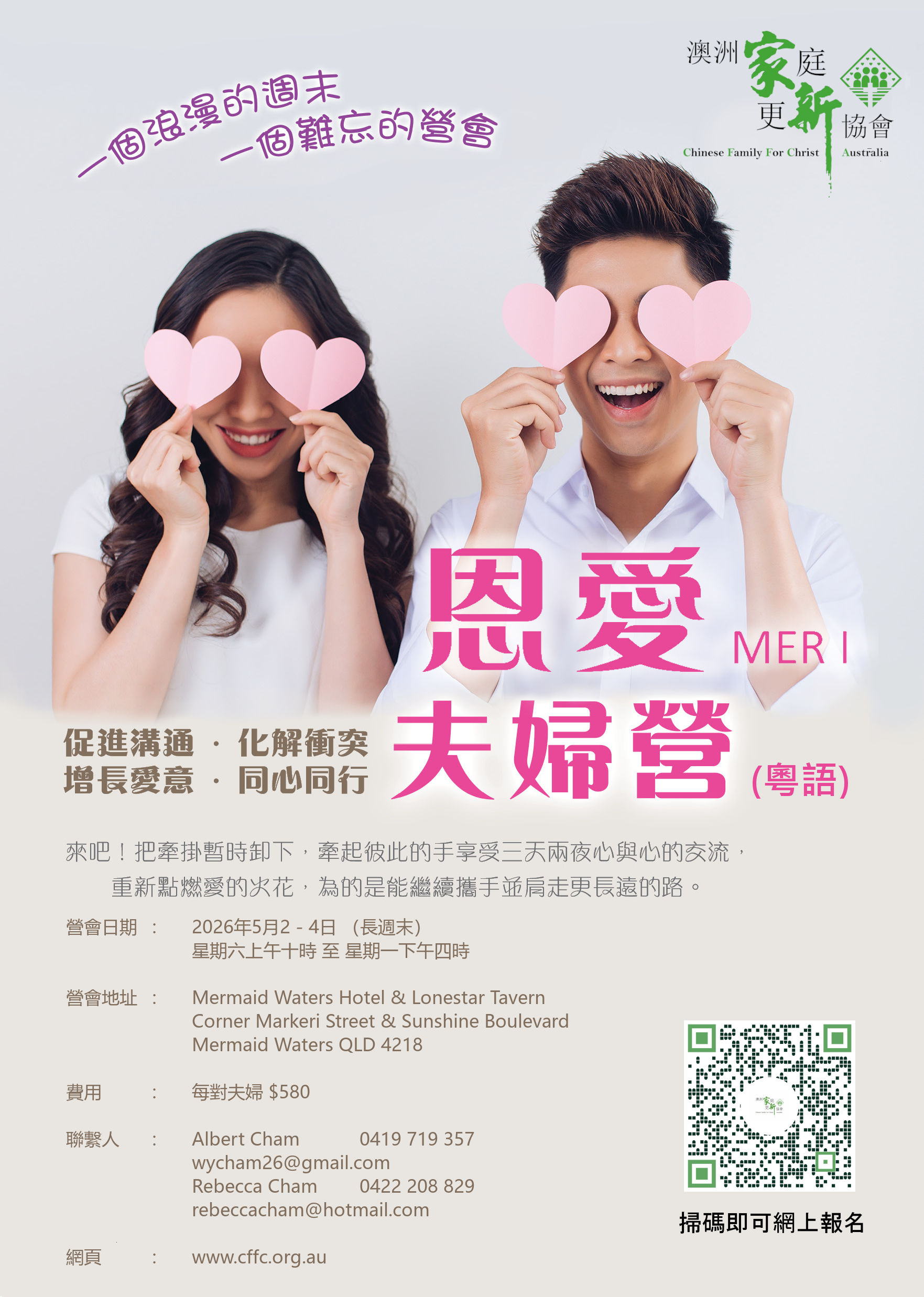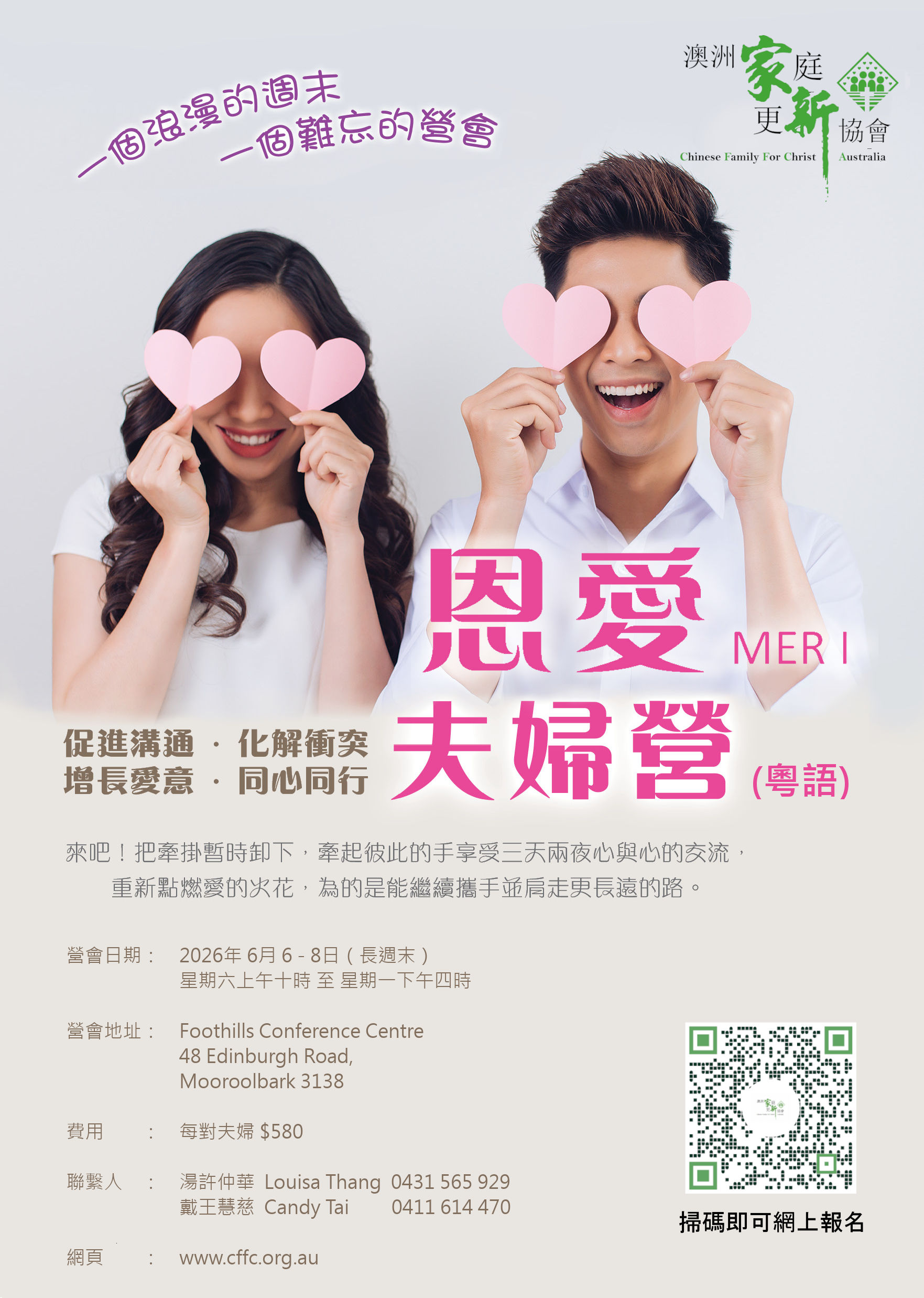 當人的婚姻與家庭,以史無前例的速度崩塌、潰散的時候,當華人教會面對越來越多的信徒婚姻破裂瓦解的時候,如何防患未然、醫治創傷、起死回生,實在是迫不及待的當務之急。恩愛夫婦營目的是建立和鞏固夫婦之恩愛關係 ; 幫助夫婦促進溝通同心同行。